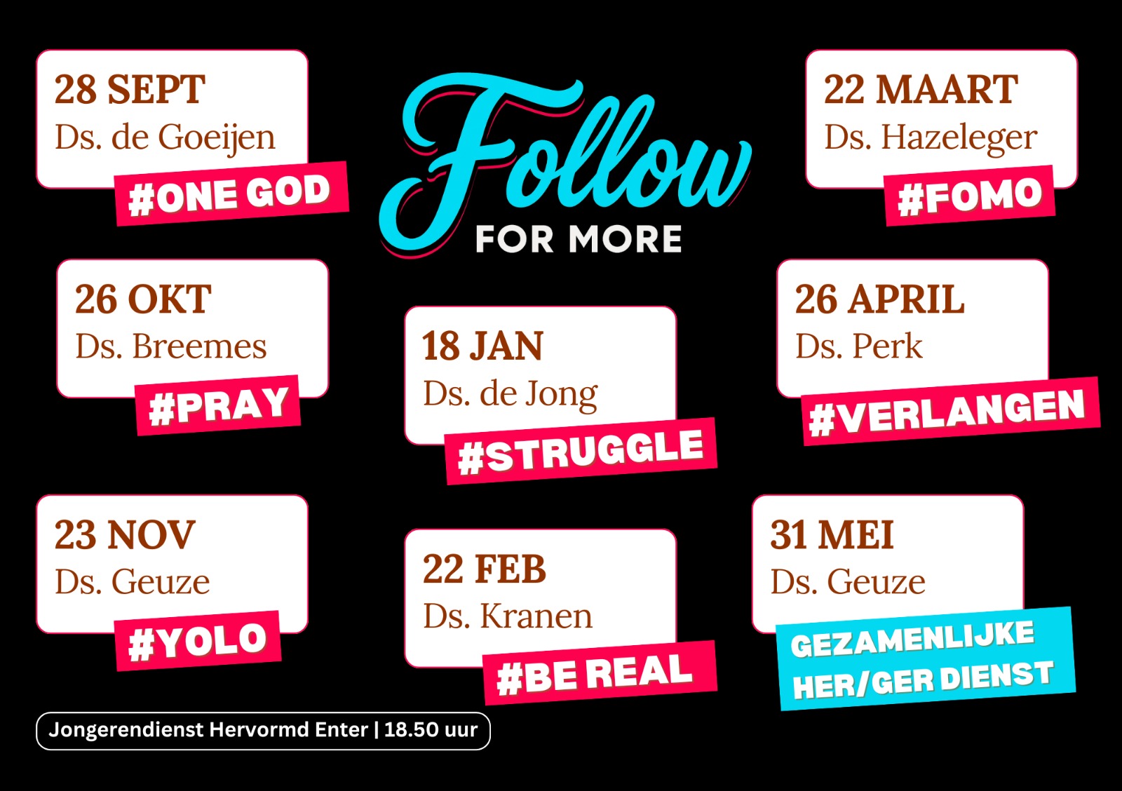 | Wanneer: | 9 diensten per jaar op zondagavond | |